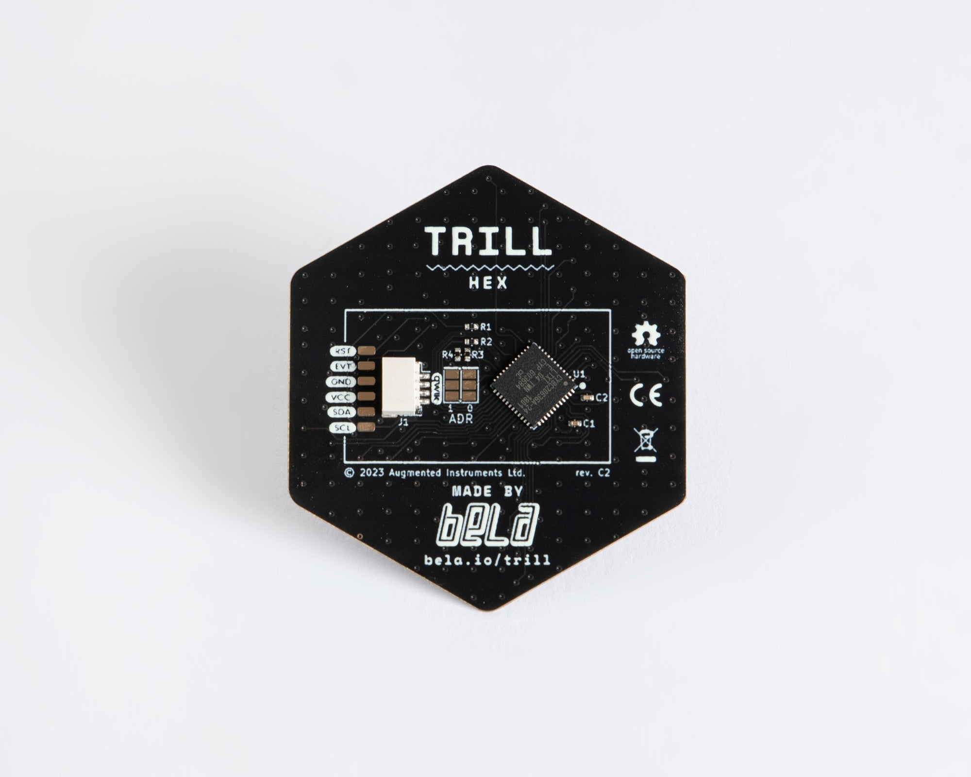 Trill Hex is a hexagonal, 2-axis x/y sensor which also senses touch size. Its hexagonal shape makes it ideal for experimenting with tessellation and creating isomorphic keyboards. Trill Hex uses a QWIIC connector, and includes a QWIIC-to-male-pin cable so you can connect it to Bela, a microcontroller, or a breadboard and start prototyping straight away.
