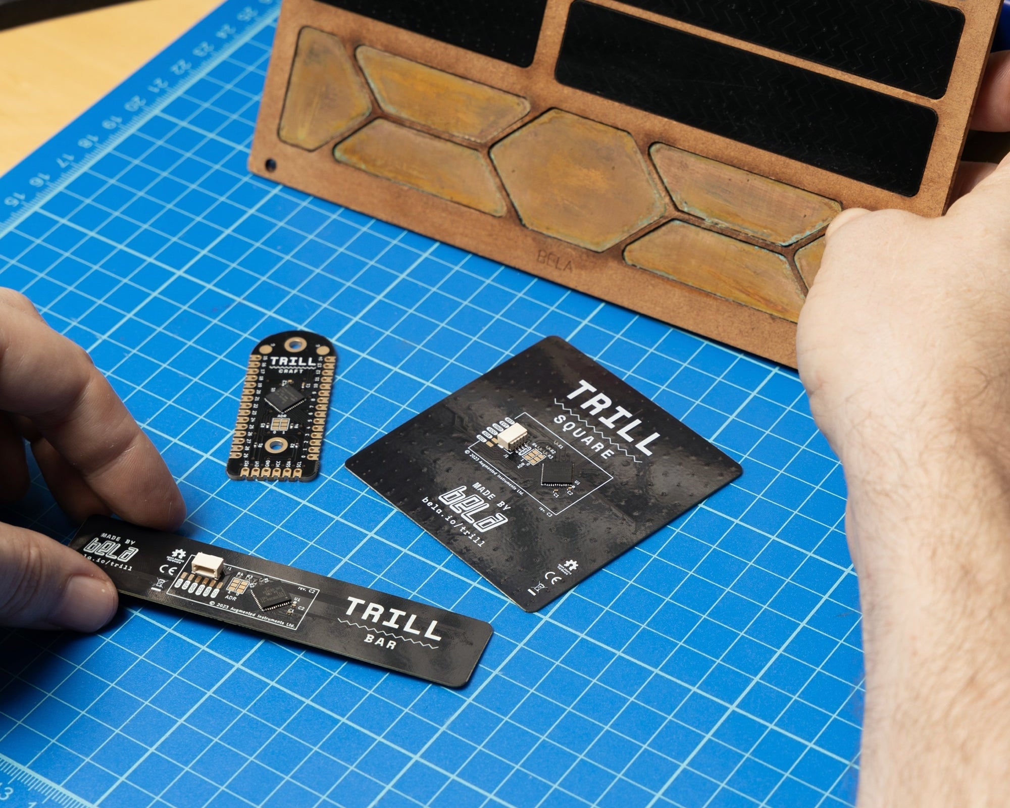 Trill is a family of touch sensors that launched on Kickstarter in 2019. Inspired by the way we use our hands to interact with the world, Trill sensors use capacitive touch technology to make it easy to add high-resolution, natural touch interaction to your interactive projects. Find out everything you need to know about using Trill at learn.bela.io/trill
